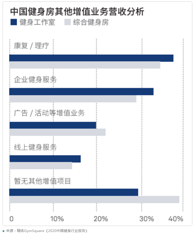 根據(jù)精練GymSquare《2020中國健身行業(yè)報(bào)告》數(shù)據(jù),在各類健身房的其他收入占比中, 康復(fù)理療占據(jù)比較重要的部分,健身房和工作室在這一部分的收入占比分別為 36.7% 和 33.8%。