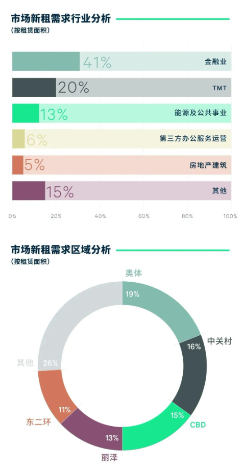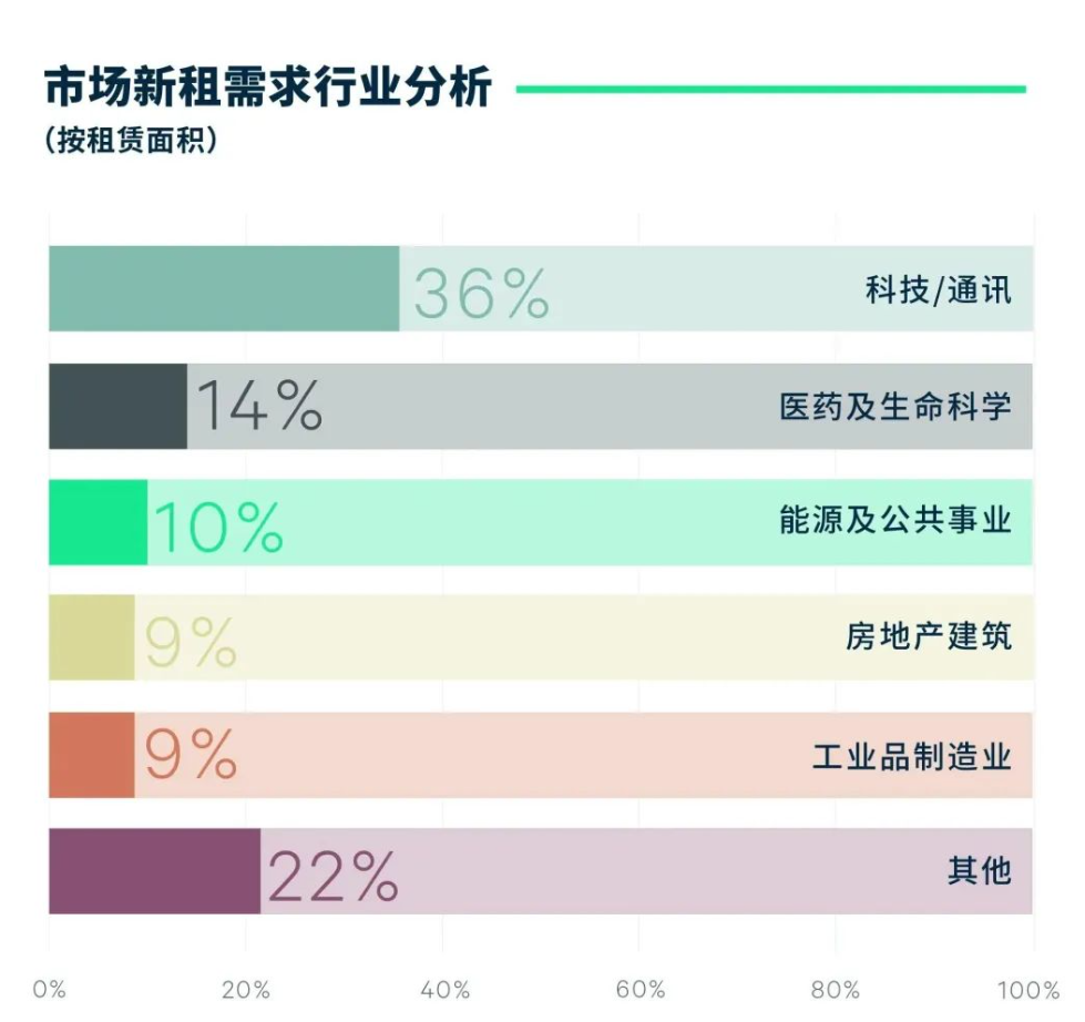 從行業(yè)角度看,金融行業(yè)表現(xiàn)穩(wěn)健,成為本季需求主力并占新租總面積的41%。升級搬遷及擴租活動多集中在傳統(tǒng)金融類租戶??萍夹袠I(yè)需求位列第二,其中活躍的租戶主要是人工智能、大數(shù)據(jù)、軟件開發(fā)和平臺互聯(lián)網(wǎng)類。能源及公共事業(yè)板塊的國有企業(yè)升級搬遷活躍,需求位居第三。醫(yī)藥及生命科學(xué)、消費品制造及工業(yè)品制造板塊的表現(xiàn)則相對轉(zhuǎn)弱。