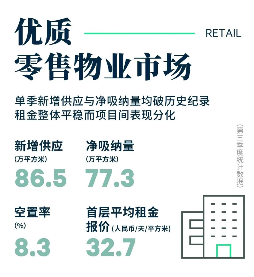 在零售市場方面,恰逢國慶假期前夕,北京零售市場非核心商圈集中交付六個優(yōu)質(zhì)零售物業(yè),共計體量86.5萬平方米,創(chuàng)單季凈吸納量歷史新高。新項目中四個位于五環(huán)以外,其余兩個則為次級商圈的更新改造項目。頭部開發(fā)商積極拓展,龍湖、萬達以輕資產(chǎn)模式分別布局朝陽北苑和海淀五棵松,此外萬達另有一座新開發(fā)項目落子朝陽東壩。