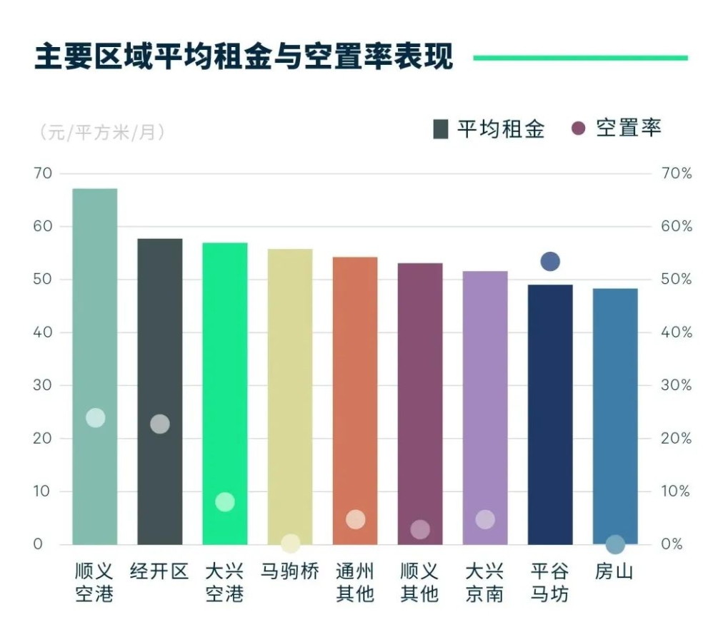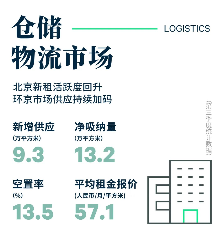而在倉儲物流方面,北京大興空港在季度內(nèi)竣工一座倉儲物流項目滿倉交付。季內(nèi)新租活動大多分布在順義空港、大興空港、大興京南、經(jīng)開區(qū)等核心子市場。由于北京市場剛需旺盛,綜合物流及針對高端消費、冷鏈的第三方物流表現(xiàn)亮眼,占新租總面積的78%,醫(yī)藥企業(yè)也借助市場可租空間增加的機會積極布局。季內(nèi)凈吸納量環(huán)比增長87%至13.2萬平方米,空置率環(huán)比下降1.5個百分點至13.5%。全市租金漲幅持續(xù)放緩,平均租金同樣本比環(huán)比微漲0.1%至每月每平方米57.1元。當下租戶端成本意識依舊較強,核心區(qū)相對入市較早的高標倉儲設(shè)施對于大面積客戶對于租金價格有所松動,為該類租戶落位提供更優(yōu)選擇。