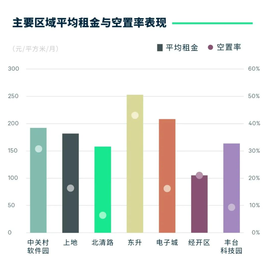 全市凈吸納量錄得8.2萬平方米,主要受新項目帶動,既有項目凈吸納量錄得負值,整體市場仍處于調(diào)整期。租金以及產(chǎn)品定位的差異使得子市場之間的去化表現(xiàn)愈發(fā)分化。類辦公物業(yè)預(yù)租或去化速度放緩,但能實現(xiàn)部分生產(chǎn)制造功能的新項目去化表現(xiàn)占優(yōu)。分區(qū)域看,中關(guān)村軟件園繼續(xù)受到頭部及腰部科技企業(yè)退租的影響,空置率持續(xù)攀升30.5%的歷史最高水平;東升也因項目租金遠超鄰近子市場,類辦公需求集中入市但需求不振等原因,空置率一路上漲超40%;而上地業(yè)主則通過下調(diào)租金、推出簡裝修或特價房源等形式,吸引了一批成本導(dǎo)向的中小企業(yè)入駐,去化部分空置面積。其他區(qū)域的表現(xiàn)相對穩(wěn)定。在分化的市場壓力下,全市商務(wù)園區(qū)租金報價同樣本比環(huán)比下降0.7%至每月每平方米158.8元,其中泛中關(guān)村集群各子市場降幅領(lǐng)先。