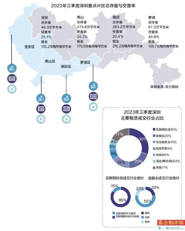 展望未來,2023年第四季度深圳將迎來六個新項目入市,為市場帶來32.9萬平方米的甲級寫字樓供應(yīng)。全市總存量將達到1104.8萬平方米,同比擴張9.9%??紤]到新增供應(yīng)規(guī)模持續(xù)處于高位,加上市場整體需求偏弱,全市空置率預(yù)計在第四季度將延續(xù)上升趨勢。據(jù)第一太平戴維斯華南區(qū)市場研究部負責人謝靖宇的預(yù)判,第四季度的深圳空置率將達到30%,這一數(shù)字明年或?qū)⑼黄?5%。