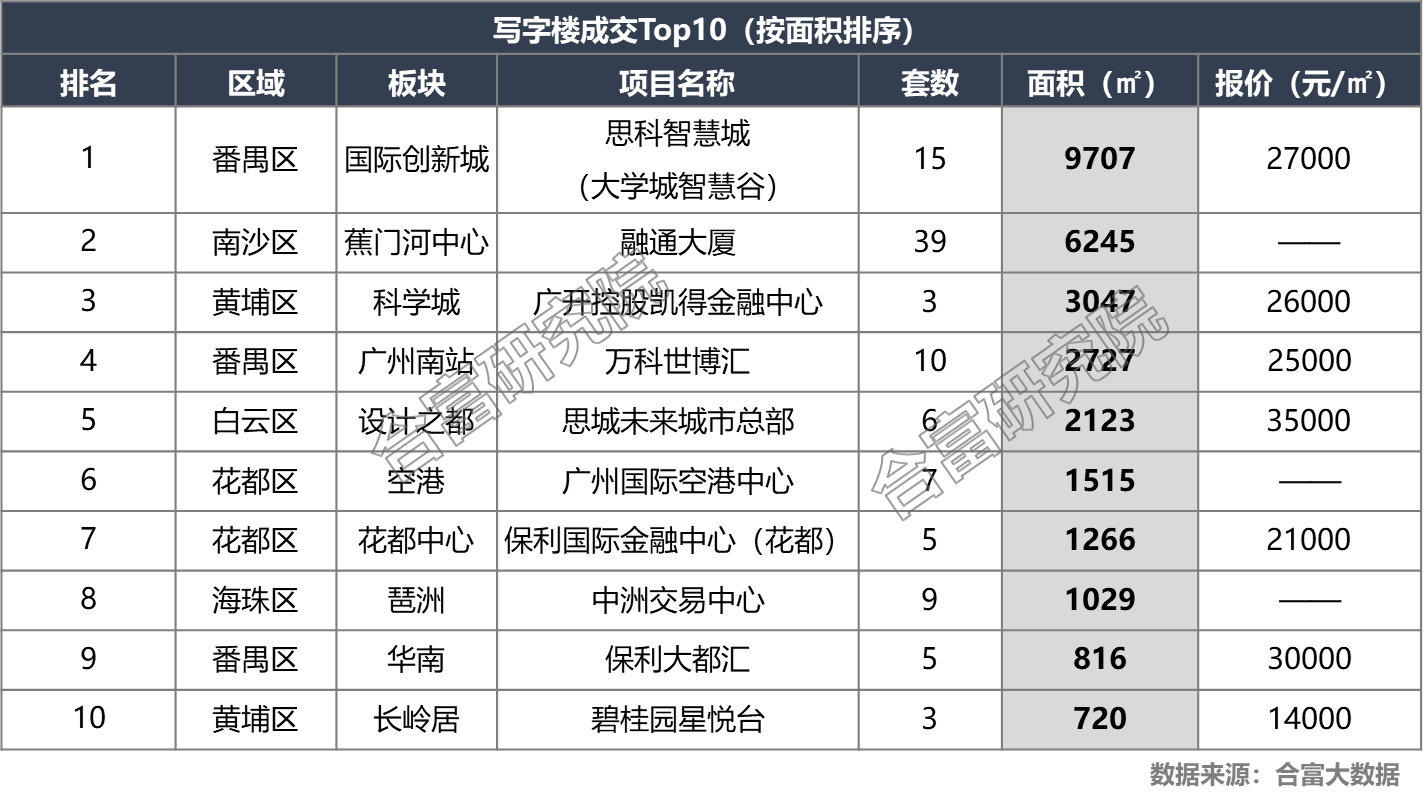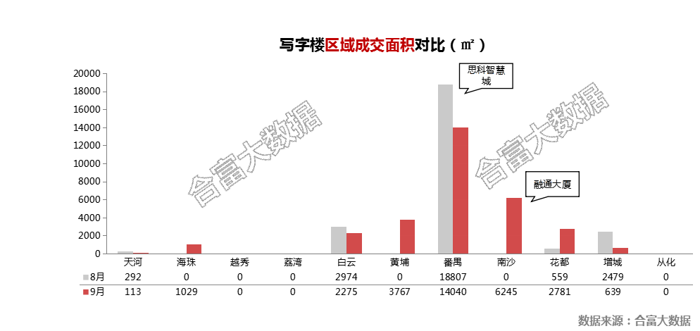 在對比八月的數(shù)據(jù)后發(fā)現(xiàn),九月有更多區(qū)域錄得成交。特別是思科智慧城連續(xù)兩個月有大量網(wǎng)簽,使番禺區(qū)持續(xù)領(lǐng)先。南沙區(qū)的融通大廈也有多個整層交易帶來了相對可觀的成交量。