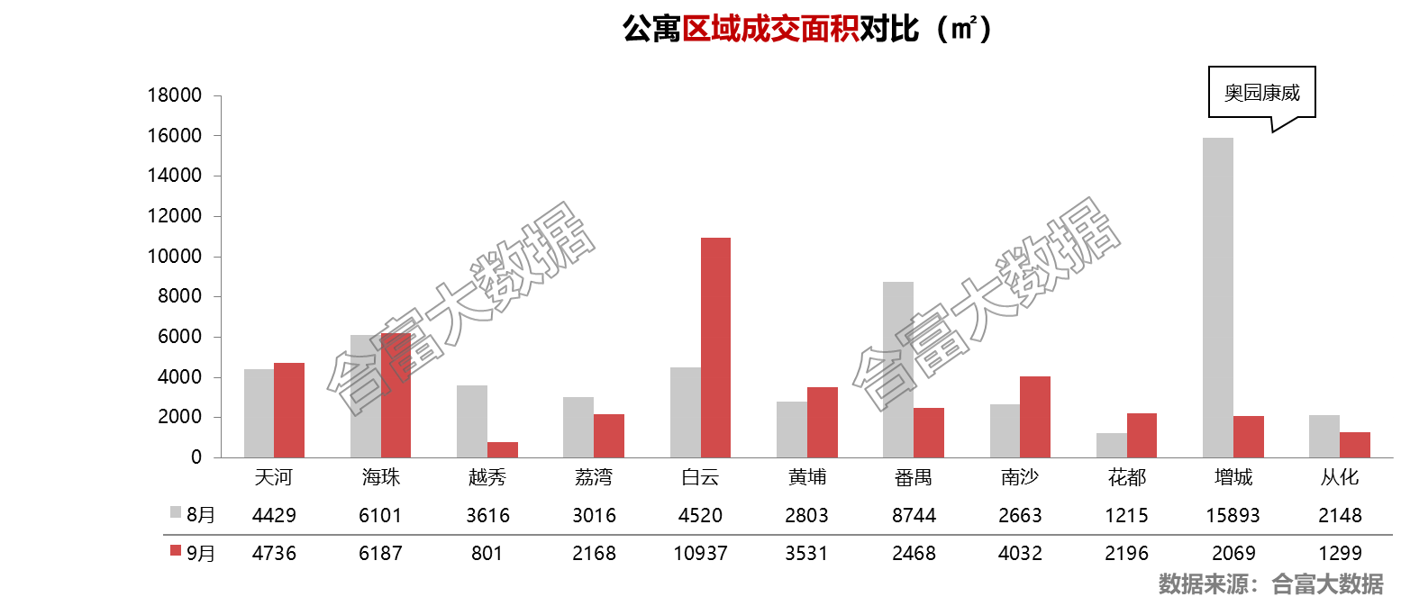 在增城、番禺、白云等地區(qū)由于若干個盤大宗交易的原因,成交量環(huán)比有較大變動;其余區(qū)域的環(huán)比變動幅度基本在1000㎡以內(nèi)。