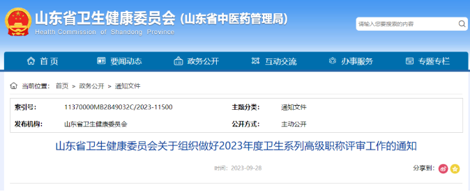 山東省衛(wèi)生健康委員會(huì)發(fā)布了《山東省衛(wèi)生健康委員會(huì)關(guān)于組織做好 2023 年度衛(wèi)生系列高級(jí)職稱評(píng)審工作的通知》。