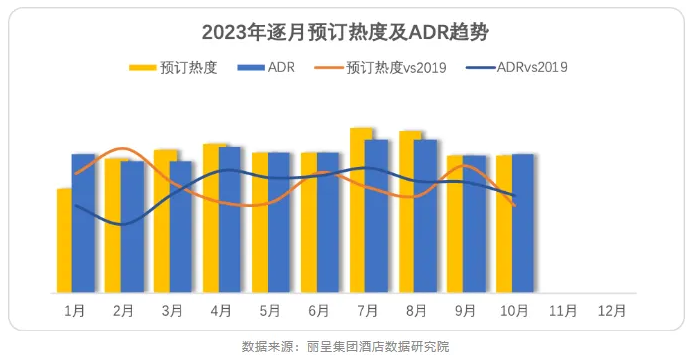 國(guó)慶長(zhǎng)假過(guò)后,市場(chǎng)進(jìn)入季節(jié)性淡季,2023年10月整體預(yù)訂熱度較19年同期基本持平,ADR受淡季影響較同期的增幅也有一定回落。