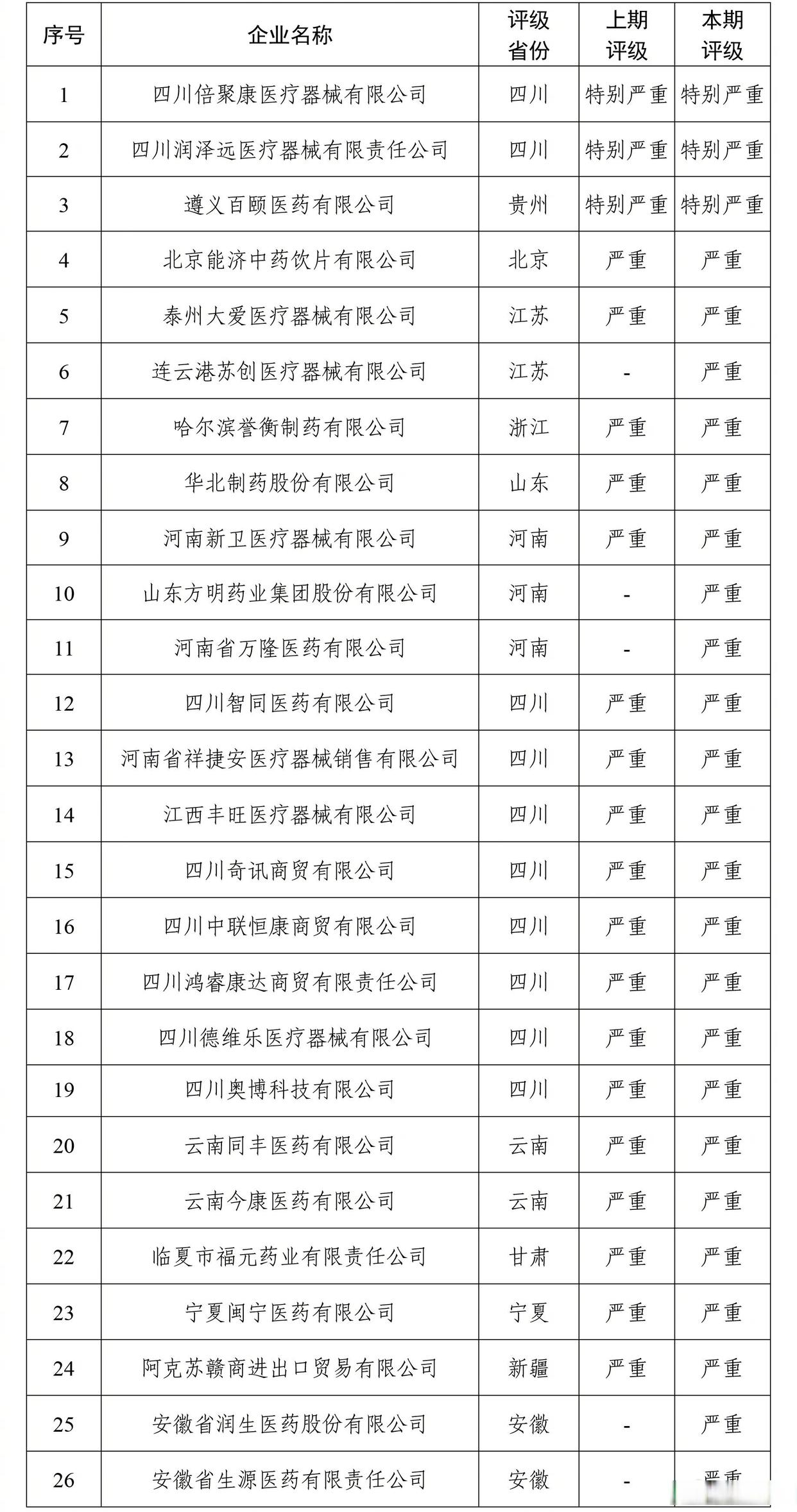 11 月 20 日,國家醫(yī)療保障局醫(yī)藥價格和招標采購指導中心匯總了 2023 年 9 月 30 日各省份評級為「特別嚴重」和「嚴重」失信的醫(yī)藥企業(yè)情況。其中, 23 家醫(yī)藥企業(yè)評級為「嚴重」,3 家醫(yī)藥企業(yè)評級為「特別嚴重」。