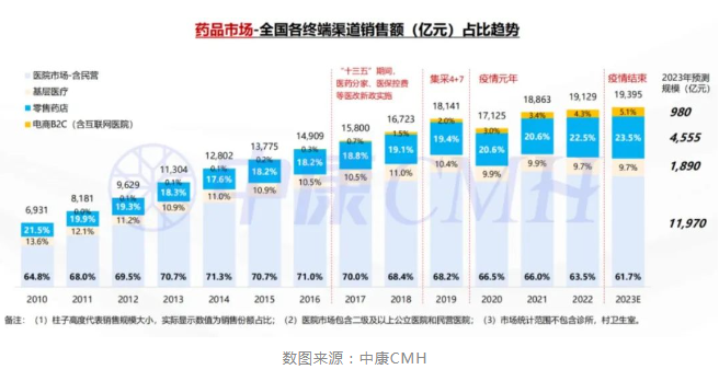根據(jù)中康CMH數(shù)據(jù),在醫(yī)改政策推動(dòng)下,零售終端占比持續(xù)擴(kuò)大,預(yù)計(jì)2023年藥品零售線下市場(chǎng)占比達(dá)到23.5%,其中電商占比由2020年的3%提升到5.1%,電商渠道市場(chǎng)空間正被越來(lái)越多藥商所重視。