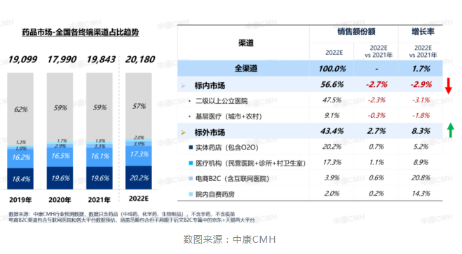 首先,2022年,我國(guó)實(shí)體藥店市場(chǎng)增速為5.2%,電商B2C市場(chǎng)增速達(dá)到了20.8%,成為藥品零售市場(chǎng)的主要推動(dòng)力。