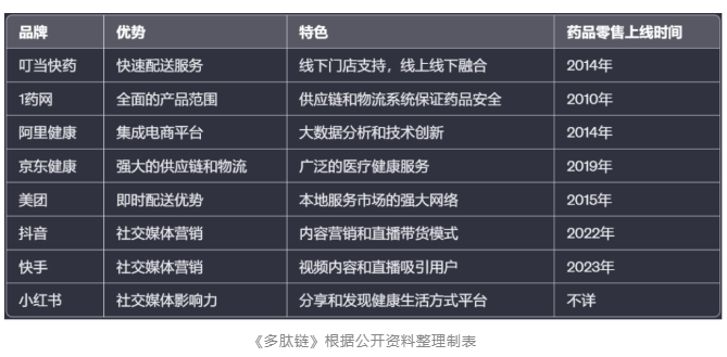 綜合而言,專業(yè)醫(yī)藥平臺(tái)先發(fā)優(yōu)勢(shì)明顯,阿里、京東和美團(tuán)在供應(yīng)鏈、倉(cāng)儲(chǔ)物流、城市覆蓋范圍及應(yīng)用場(chǎng)景方面更具優(yōu)勢(shì),抖音、快手、小紅書(shū)雖然在這一賽道起步晚,但在用戶基礎(chǔ)和社交媒體特性及曝光率方面優(yōu)勢(shì)明顯。