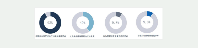由于認(rèn)知不足和社會(huì)歧視,我國(guó)精神疾病的診斷和治療比例較低,約92%的精神疾病患者從未接受過(guò)治療。雖然焦慮障礙在我國(guó)發(fā)病率最高,但對(duì)于焦慮障礙的認(rèn)識(shí)卻嚴(yán)重不足,只有40%的患者認(rèn)為焦慮障礙需要治療,認(rèn)為自己需要接受足量治療的患者僅有9.8%。