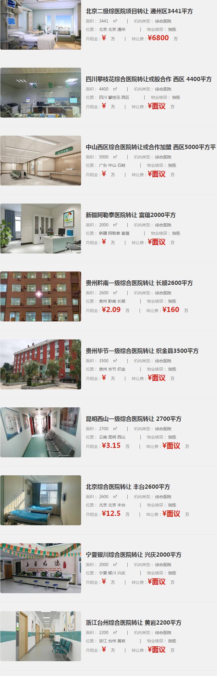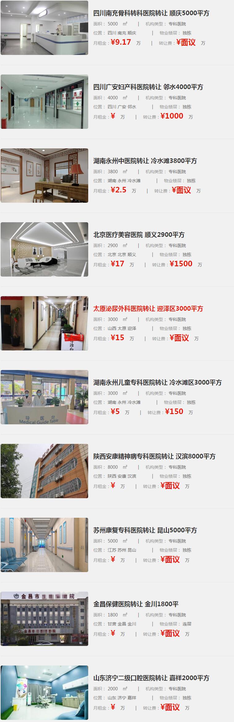以下述信息包含了多家醫(yī)療機(jī)構(gòu)的轉(zhuǎn)讓信息,涉及綜合醫(yī)院、??漆t(yī)院等不同類型的機(jī)構(gòu),以及其所在地區(qū)、面積、物業(yè)樓層、月租金和轉(zhuǎn)讓費(fèi)用等方面的詳細(xì)內(nèi)容。