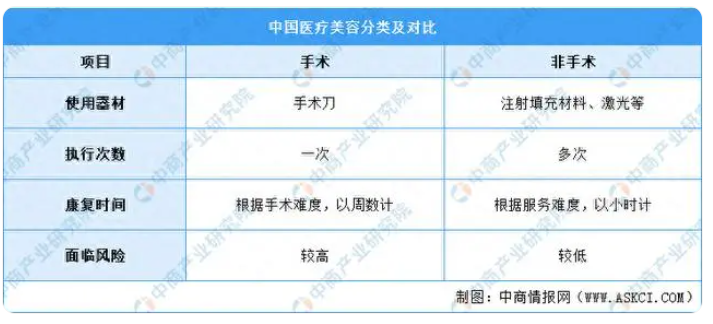 醫(yī)療美容根據(jù)是否需要手術(shù),分為手術(shù)類和非手術(shù)類醫(yī)療美容,均是由經(jīng)注冊的專業(yè)醫(yī)師及醫(yī)療專家進(jìn)行。手術(shù)類醫(yī)療美容服務(wù)指的是通過手術(shù)對胸、鼻、眼皮及其他身體部位進(jìn)行侵入性地改變,旨在從根本上改變外觀。非手術(shù)類醫(yī)療美容服務(wù)又稱為微整形,主要包括注射療法和激光療法。