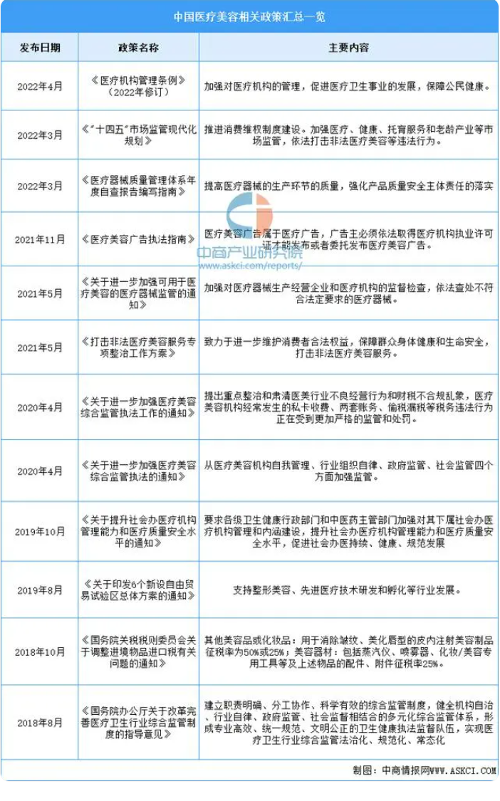 近年來,國務(wù)院、國家衛(wèi)生部、商務(wù)部、國家食品藥品監(jiān)督管理總局等部門出臺(tái)了多項(xiàng)政策監(jiān)管細(xì)則,規(guī)范醫(yī)美行業(yè)?!夺t(yī)療機(jī)構(gòu)管理?xiàng)l例》《醫(yī)療器械質(zhì)量管理體系年度自查報(bào)告編寫指南》《醫(yī)療美容廣告執(zhí)法指南》《關(guān)于進(jìn)一步加強(qiáng)可用于醫(yī)療美容的醫(yī)療器械監(jiān)管的通知》等多項(xiàng)政策,明確醫(yī)療機(jī)構(gòu)、醫(yī)美醫(yī)師及醫(yī)美項(xiàng)目實(shí)施準(zhǔn)入要求管理,引導(dǎo)消費(fèi)者識(shí)別合法正規(guī)機(jī)構(gòu),防范不合規(guī)醫(yī)美機(jī)構(gòu)野蠻生長,促進(jìn)醫(yī)美行業(yè)健康有序發(fā)展。具體政策如下: