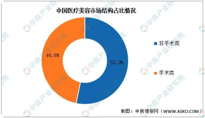 醫(yī)療美容是消費(fèi)行業(yè)中的黃金賽道,其中具有靈活、創(chuàng)傷小、恢復(fù)期短、風(fēng)險(xiǎn)低等特點(diǎn)非手術(shù)類的輕醫(yī)療美容發(fā)展迅速,2022年我國非手術(shù)類的輕醫(yī)療美容市場規(guī)模達(dá)1207億元,占整體市場的53.2%,手術(shù)類占比達(dá)46.8%。