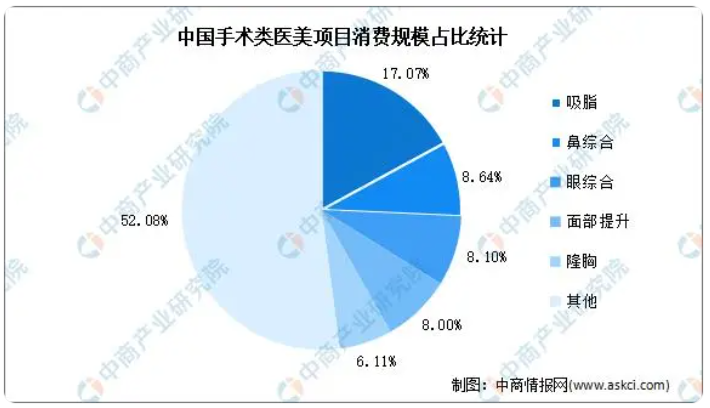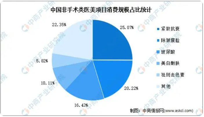 從細(xì)分項(xiàng)目看,中國手術(shù)類項(xiàng)目前五分別為吸脂(占比17.07%)、鼻綜合(8.64%)、眼綜合(8.10%)、面部提升(8%)、隆胸(6.11%),非手術(shù)類項(xiàng)目前五分別為緊致抗衰(25.07%)、除皺瘦臉(20.22%)、玻尿酸(16.43%)、美白嫩膚(10.11%)、祛斑去色素(5.82%)。