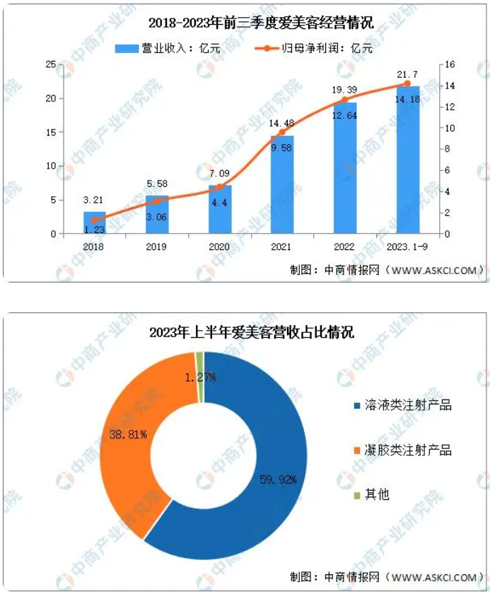 2023年前三季度實(shí)現(xiàn)營業(yè)收入21.7億元,同比增長45.74%;實(shí)現(xiàn)歸母凈利潤14.18億元,同比增長42.94%。2023年上半年主營產(chǎn)品包括溶液類注射產(chǎn)品、凝膠類注射產(chǎn)品,分別占整體營收的59.92%、38.81%。