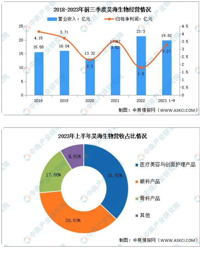 2023年前三季度實(shí)現(xiàn)營業(yè)收入19.82億元,同比增長25.21%;實(shí)現(xiàn)歸母凈利潤3.27億元,同比增長101.85%。2023年上半年主營產(chǎn)品包括醫(yī)療美容與創(chuàng)面護(hù)理產(chǎn)品、眼科產(chǎn)品、骨科產(chǎn)品,分別占整體營收的36.93%、36.60%、17.66%。