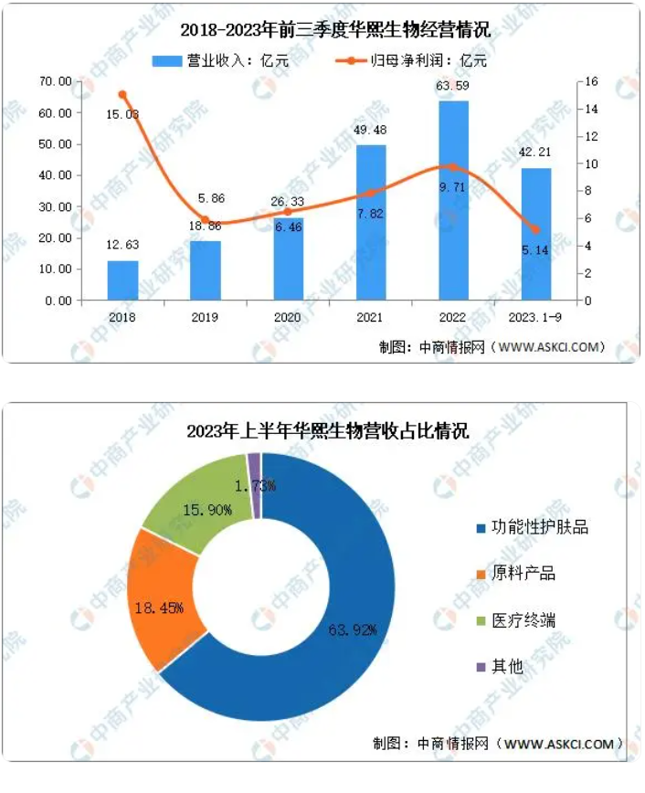 2023年前三季度實(shí)現(xiàn)營業(yè)收入42.21億元,同比下降2.29%;實(shí)現(xiàn)歸母凈利潤5.14億元,同比下降24.08%。2023年上半年主營產(chǎn)品包括功能性護(hù)膚品、原料產(chǎn)品、醫(yī)療終端,分別占整體營收的63.92%、18.45%、15.90%。