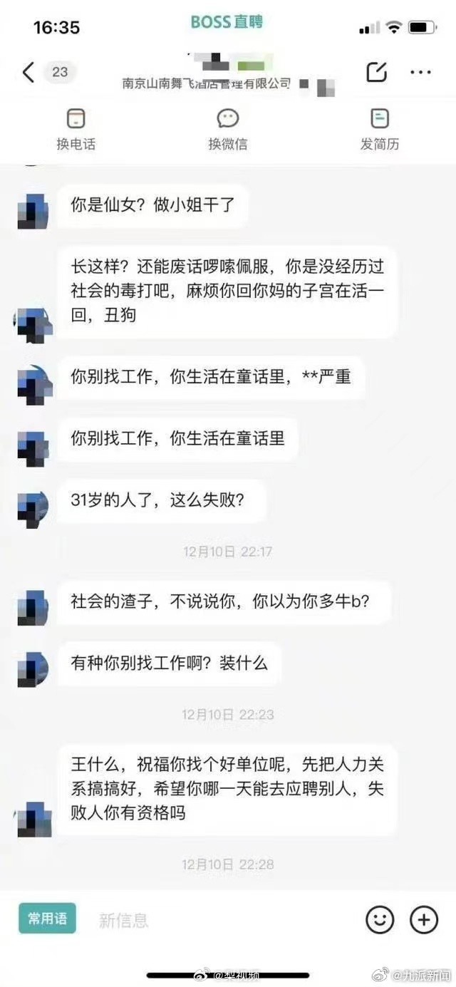 “無雙湖泊”告訴海報新聞記者,自己于12月10日晚在招聘平臺上應(yīng)聘工作地點為南京馬群美寓酒店的前臺崗位,在溝通待遇及休假情況時,HR提到“保安月休一天,前臺頂上”?!盁o雙湖泊”隨后詢問“那過年(休假)呢?”,不料該HR竟稱“過年還要有假期,麻煩你找個公司給你無限放假”,并對她進行了辱罵,稱她為“社會渣子”“弱智兒童”。