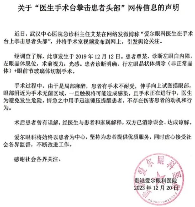 12月21日凌晨,“貴港愛爾眼科”微信公眾號發(fā)布關(guān)于“醫(yī)生手術(shù)臺拳擊患者頭部”網(wǎng)傳信息的聲明。