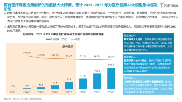 隨著技術(shù)成熟度以及數(shù)據(jù)可用性增加,醫(yī)療健康A(chǔ)I大模型對醫(yī)療場景中(如藥物發(fā)現(xiàn)、個(gè)性化醫(yī)療、醫(yī)學(xué)影像、數(shù)據(jù)增強(qiáng))的部分研發(fā)阻礙給出解決方案,加快醫(yī)療研發(fā)速度。同時(shí),其生成式人工智能操作難度低,更能夠被醫(yī)療領(lǐng)域的專業(yè)人員接受并使用。因此根據(jù)億歐預(yù)測,2023-2027年為醫(yī)療健康A(chǔ)I大模型集中爆發(fā)的階段。