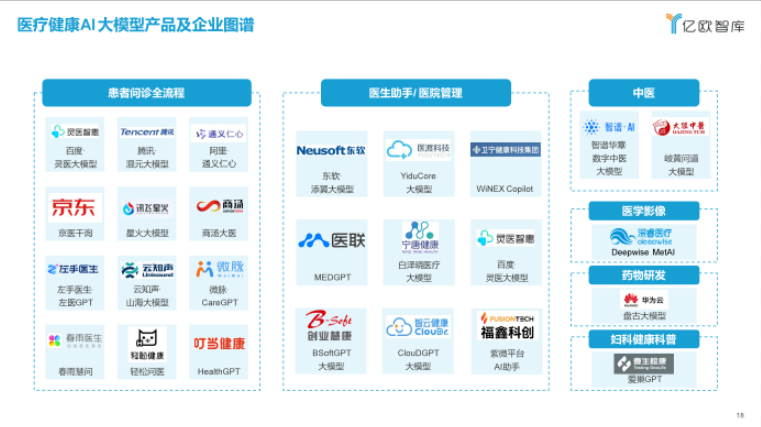 醫(yī)療健康A(chǔ)I大模型產(chǎn)品主要在醫(yī)療機(jī)構(gòu)、醫(yī)藥企業(yè)、零售藥店以及互聯(lián)網(wǎng)醫(yī)療這四類企業(yè)應(yīng)用。當(dāng)前,醫(yī)療科技企業(yè)與基礎(chǔ)大模型企業(yè)積極合作,AI大模型醫(yī)療健康生態(tài)正在逐步建立。