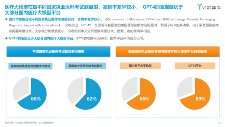 醫(yī)療大模型在做不同國家執(zhí)業(yè)醫(yī)師考試題目時(shí),準(zhǔn)確率差異較小。GPT4的表現(xiàn)優(yōu)于大部分國內(nèi)醫(yī)療大模型平臺(tái)。GPT4的準(zhǔn)確率為69%,國內(nèi)平臺(tái)平均值為66%。