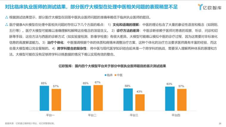 對比臨床執(zhí)業(yè)醫(yī)師的測試結(jié)果,部分醫(yī)療大模型在處理中醫(yī)相關(guān)問題的表現(xiàn)稍顯不足。醫(yī)療健康A(chǔ)I大模型在處理中醫(yī)相關(guān)問題時(shí)存在以下幾個(gè)方面的難點(diǎn):
