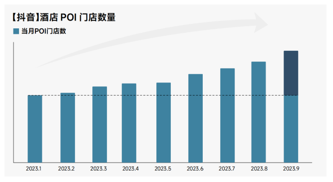 數(shù)據(jù)顯示,截至2023年9月,共有1.4萬個景區(qū)、超過10萬家酒店在抖音開設(shè)了官方賬號。具體到住宿商家,對比年初的水平,酒店P(guān)OI門店數(shù)量增長了61%,整體規(guī)模逐月增加。根據(jù)交銀國際預(yù)測,2023年抖音本地生活服務(wù)規(guī)模將達到2500 億元,其中酒旅GMV實現(xiàn)600億,接近美團的四分之一;2024年抖音酒旅GMV則會達到900億,規(guī)模約為美團的28%、兩者差距進一步縮小。
