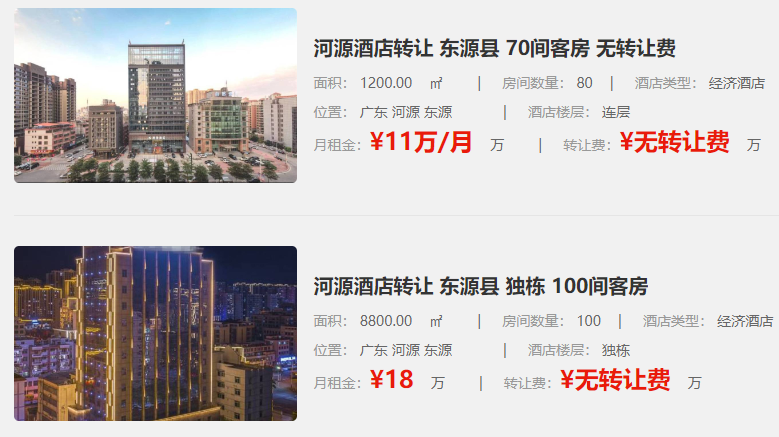據(jù)悉,這些尋求轉(zhuǎn)讓的酒店均位于河源市的不同城區(qū),包括源城區(qū)和紫金縣等。它們的房間數(shù)量從35間到100間不等,面積也從880㎡到8800㎡不同。這些酒店的月租金在¥2.7萬至¥18萬之間,其中大部分酒店的轉(zhuǎn)讓費(fèi)均為無轉(zhuǎn)讓費(fèi),只有少數(shù)酒店的轉(zhuǎn)讓費(fèi)為面議或具體數(shù)字。