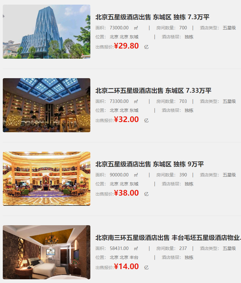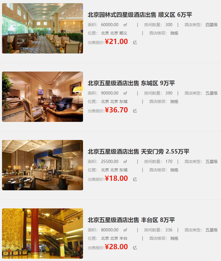 首先,位于順義區(qū)的園林式四星級酒店,面積達(dá)6萬平方米,擁有300個(gè)房間,報(bào)價(jià)21億元。此外,東城區(qū)的五星級酒店,面積9萬平方米,房間數(shù)量390,報(bào)價(jià)36.7億元。另一處天安門旁的五星級酒店,面積2.55萬平方米,房間數(shù)量170,報(bào)價(jià)18億元。豐臺區(qū)的五星級酒店,面積8萬平方米,房間數(shù)量336,報(bào)價(jià)28億元。