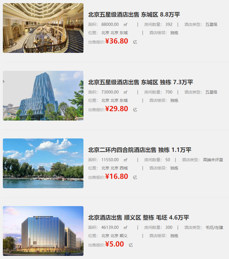 除此之外,東城區(qū)還有多處五星級酒店轉(zhuǎn)讓出售,其中包括面積8.8萬平方米,房間數(shù)量392的酒店,報(bào)價(jià)36.8億元;面積7.3萬平方米,房間數(shù)量700的酒店,報(bào)價(jià)29.8億元。西城區(qū)的四合院酒店,面積1.1萬平方米,房間數(shù)量50,報(bào)價(jià)16.8億元。順義區(qū)的整棟毛坯酒店,面積4.6萬平方米,房間數(shù)量300,報(bào)價(jià)5億元。