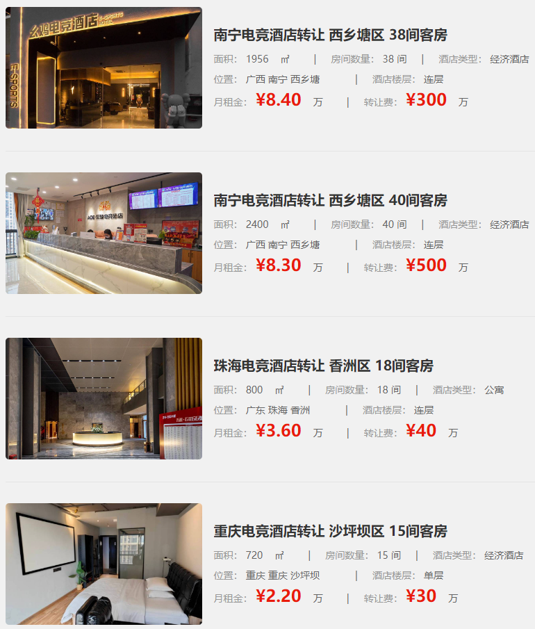 在廣西南寧,西鄉(xiāng)塘區(qū)的一家38間客房的經(jīng)濟(jì)型電競酒店,以及40間客房的同類型酒店均掛牌轉(zhuǎn)讓,轉(zhuǎn)讓費(fèi)分別為300萬元和500萬元。緊隨其后的是珠海香洲區(qū)的一家公寓式電競酒店,擁有18間客房,轉(zhuǎn)讓費(fèi)為40萬元。