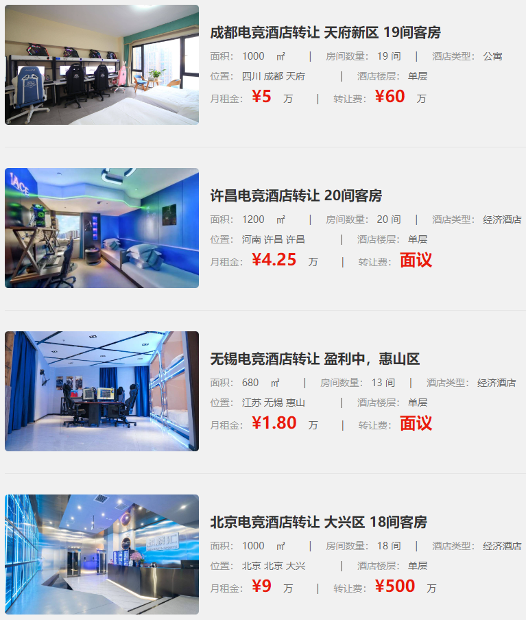 湖南長沙縣和山西太原小店區(qū)的電競酒店也分別以150萬元和50萬元的轉(zhuǎn)讓費(fèi)尋求新東家。西安新城區(qū)的一家12間客房的經(jīng)濟(jì)型電競酒店,轉(zhuǎn)讓費(fèi)為30萬元,成都成華區(qū)的14間客房的公寓型電競酒店,轉(zhuǎn)讓費(fèi)為25萬元。