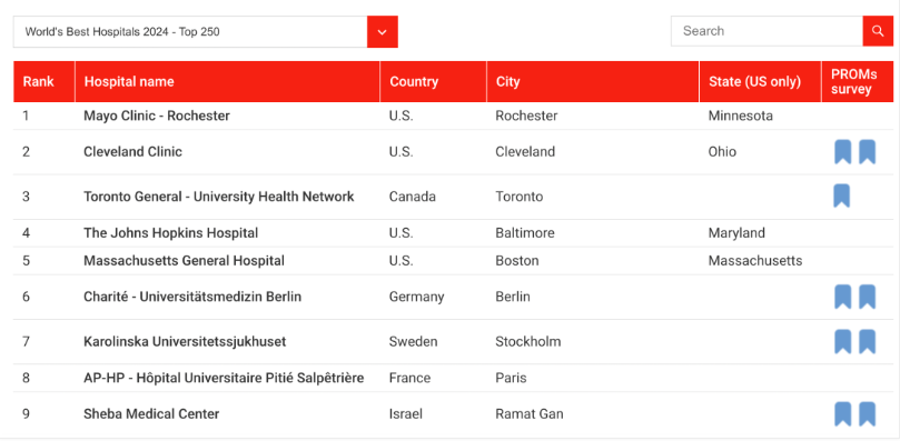 本次最佳醫(yī)院排名中,Mayo Clinic(梅奧診所,美國)、Cleveland Clinic(克利夫蘭診所,美國)和Toronto General - University Health Network(多倫多總醫(yī)院,加拿大)分列前三名。其中前兩位與2023年一致,而多倫多總醫(yī)院是新晉三甲;去年是麻省總醫(yī)院。其中Mayo 已連續(xù)六年獲得該榜單第一名。2024年全球最佳醫(yī)院排名是從30個國家/地區(qū)的2400所最佳醫(yī)院中排列出,智利和馬來西亞的醫(yī)院首次列入排名,和去年一樣,暫時未包括中國的醫(yī)院。2024年全球最佳醫(yī)院排名的評選標(biāo)準(zhǔn)有兩個:A,采用同行推薦及評分、患者評分、醫(yī)院質(zhì)量指標(biāo)、以及醫(yī)院實(shí)施和使用 PROM 的在線調(diào)查(可選)等四個綜合指標(biāo)完成最終評分。B,四個綜合指標(biāo)的權(quán)重并不一樣,總體來說同行推薦權(quán)重最高,其次是醫(yī)院質(zhì)量指標(biāo),而患者評分和在線調(diào)查的權(quán)重則很小。2024年特別增加了醫(yī)院質(zhì)量指標(biāo)的權(quán)重。