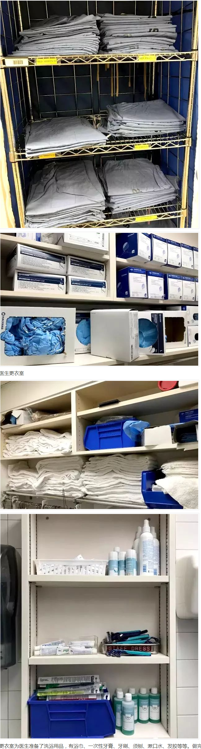 更衣室為醫(yī)生準(zhǔn)備了洗浴用品,有浴巾、一次性牙膏、牙刷、須刨、漱口水、發(fā)膠等等。做完一天的手術(shù)之后洗個熱水澡,消除疲勞,再打扮的漂漂亮亮的出去。