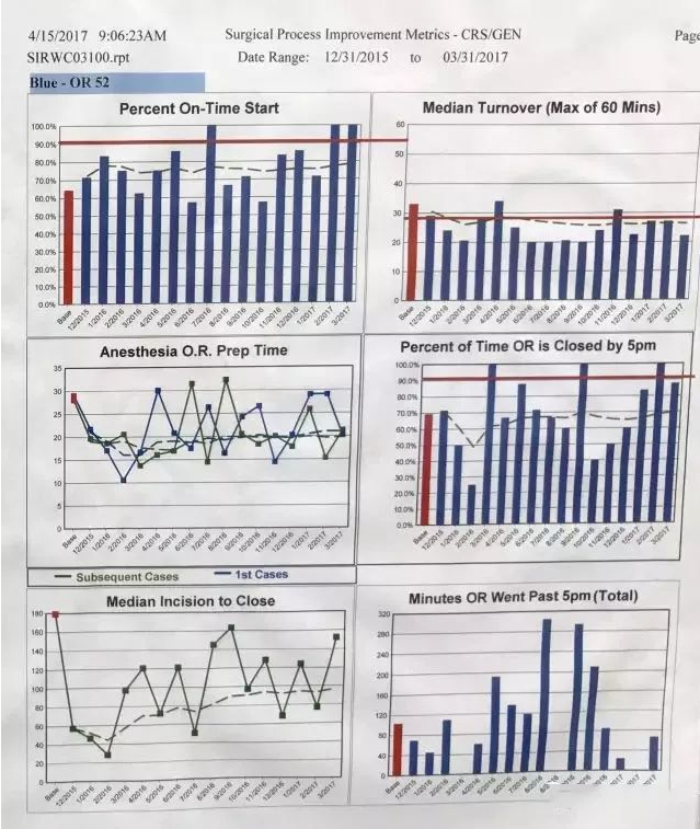 手術(shù)室門上的《手術(shù)流程改進(jìn)考核表》該表統(tǒng)計(jì)了從2015.12.31--2017.03.31日手術(shù)按時開始的比例、麻醉準(zhǔn)備時間、手術(shù)從開腹到關(guān)腹的中位時間、手術(shù)接臺時間、手術(shù)間在5點(diǎn)鐘關(guān)閉的比例,還有手術(shù)時間超過下午5點(diǎn)的平均分鐘數(shù)。如果發(fā)現(xiàn)哪個環(huán)節(jié)出了問題,會及時改進(jìn),提高工作效率。