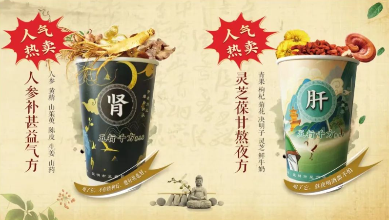 兩個月后,云南鴻仁堂中醫(yī)館五行千方養(yǎng)生茶飲店開業(yè),其以藥食同源為理念,推出了人參補甚益氣方、靈芝葆甘熬夜方等草本養(yǎng)生茶飲。作為傳統(tǒng)型的中醫(yī)館,鴻仁堂以中醫(yī)診療、理療、慢性病調(diào)理等為主營業(yè)務,也在緊隨時代發(fā)展潮流,加入中醫(yī)+茶飲賽道。