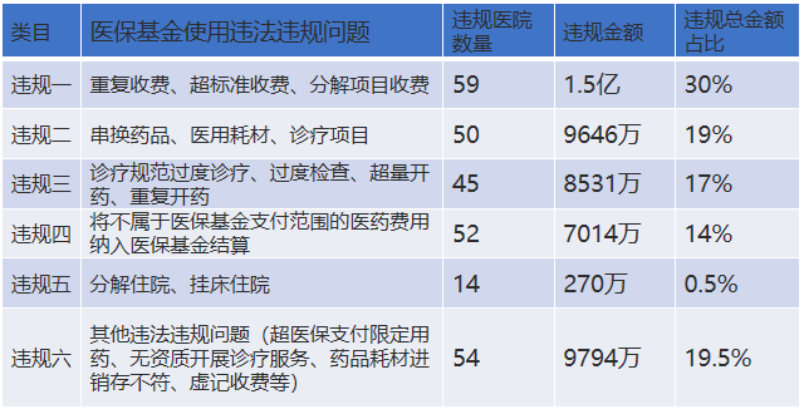 2022年度醫(yī)?;痫w行檢查,國家醫(yī)保局抽查了48家定點醫(yī)療機構(gòu),其中:46家存在串換藥品、醫(yī)用耗材、診療項目和服務(wù)設(shè)施,檢出率95.8%。43家存在將不屬于醫(yī)保基金支付范圍的醫(yī)藥費用納入醫(yī)?;鸾Y(jié)算,檢出率89.6%。39家存在違反診療規(guī)范過度診療、過度檢查、超量開藥,檢出率81.3%。受檢的48家醫(yī)療機構(gòu)都存在重復(fù)收費、超標準收費、分解項目收費的問題,檢出率100%。