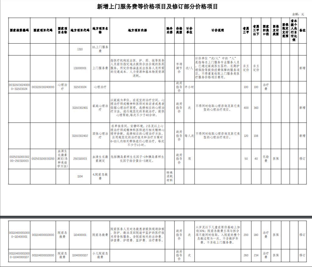為適應(yīng)臨床診療和價(jià)格管理需要,促進(jìn)新技術(shù)新項(xiàng)目臨床運(yùn)用,經(jīng)研究,決定新增上門服務(wù)費(fèi)等醫(yī)療服務(wù)價(jià)格項(xiàng)目,并對部分醫(yī)療服務(wù)價(jià)格項(xiàng)目進(jìn)行修訂。現(xiàn)就有關(guān)事項(xiàng)通知如下: