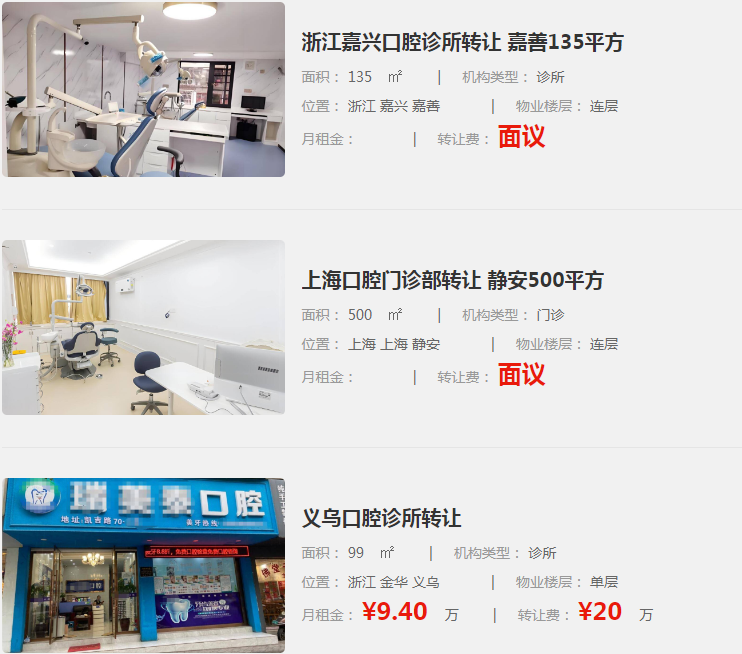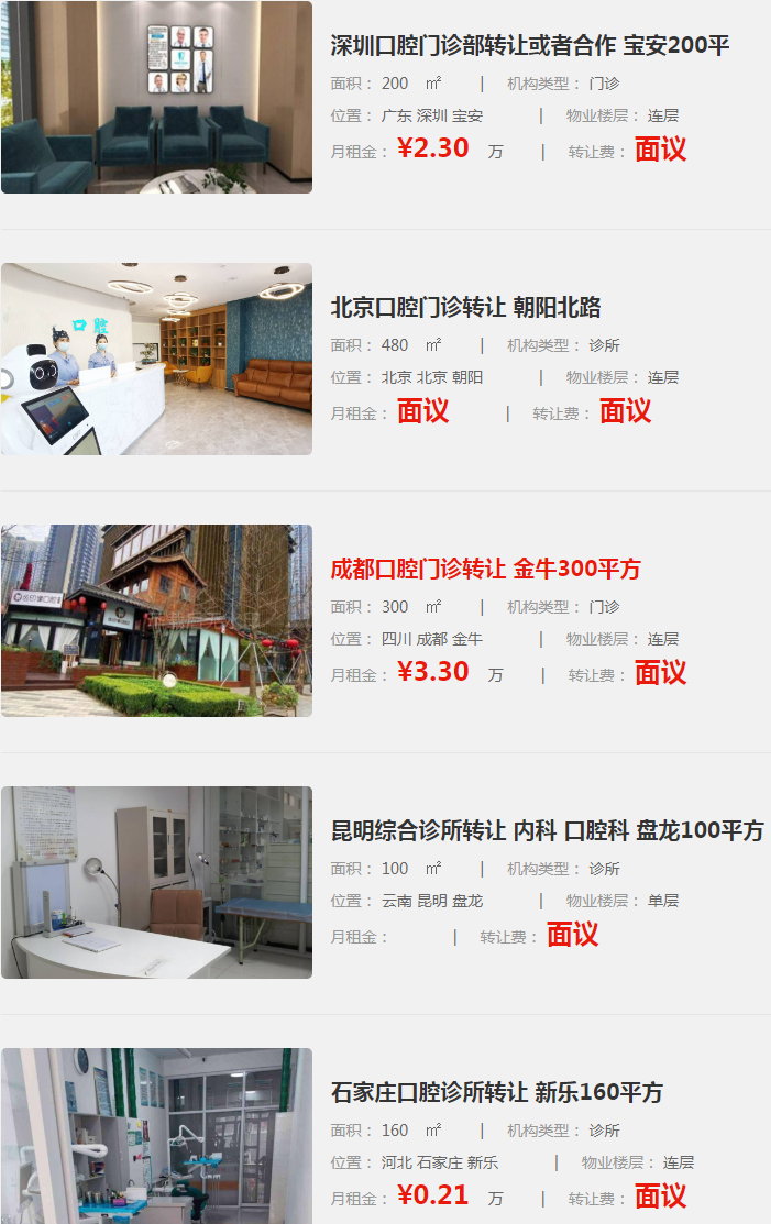 指點(diǎn)網(wǎng)提供關(guān)于不同地區(qū)口腔診所和門診部的轉(zhuǎn)讓信息。每個(gè)條目提供了面積、機(jī)構(gòu)類型、位置、物業(yè)樓層、月租金和轉(zhuǎn)讓費(fèi)的信息。以下是對(duì)每條信息的簡(jiǎn)要解析: