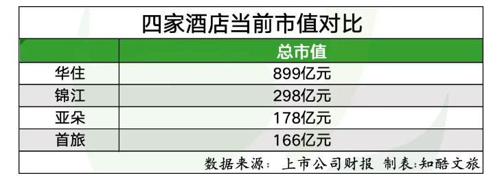 這些差距,已經(jīng)反應(yīng)在四家酒店的市值上。截止2024年4月1日,華住市值899億元,是錦江的3倍,是首旅5.4倍。而亞朵的市值也已經(jīng)超過(guò)了首旅酒店,成為中國(guó)酒店領(lǐng)域排名第三的上市公司。資本市場(chǎng)是嗅覺(jué)最敏銳的,資本市場(chǎng)也最看重預(yù)期,投資者以真金白銀交易出來(lái)的市值,是企業(yè)綜合實(shí)力的最佳評(píng)估依據(jù)。