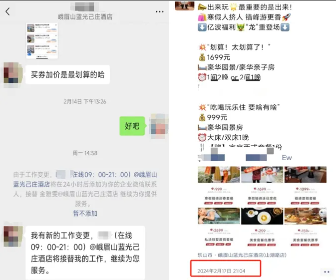“房間很有特點(diǎn),有叢林、海洋、國學(xué)等風(fēng)格,每次去孩子都特別喜歡,像走進(jìn)了童話故事。還可以喂小動(dòng)物,上親子課?!奔呵f的消費(fèi)者余杭(化名)告訴《每日經(jīng)濟(jì)新聞》記者,4月8日他發(fā)現(xiàn)自己添加了幾年的己莊“管家”突然進(jìn)行了工作變更?!爱?dāng)時(shí)也沒多想,因?yàn)橐粋€(gè)多月前(2月中旬),管家還聯(lián)系我參加酒店的優(yōu)惠活動(dòng),向我推銷團(tuán)購券?!?/span>