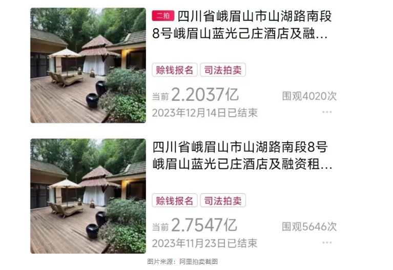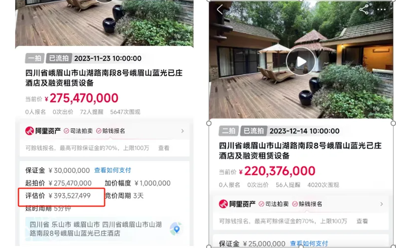 《每日經(jīng)濟(jì)新聞》記者通過阿里拍賣查詢到,2023年11月,己莊酒店及融資租賃設(shè)備被打包拍賣,評(píng)估價(jià)高達(dá)3.935億元,起拍價(jià)為2.7547億元,但因?yàn)闊o人報(bào)名競(jìng)拍,遭遇了首次流拍。2023年12月,己莊被二次拍賣,起拍價(jià)降至2.2億元,比之前降低約5500萬元,但仍無人報(bào)名、無人出價(jià),再次流拍。