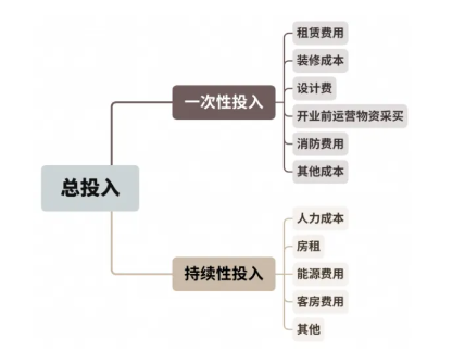 裝修投入對于不同的酒店金額各不相同,影響的因素也較多;持續(xù)性投入主要包含酒店在營期間的全部成本和費(fèi)用,其中包含房租、客用品、人力成本、能源等各項(xiàng)經(jīng)營中產(chǎn)生的費(fèi)用。
