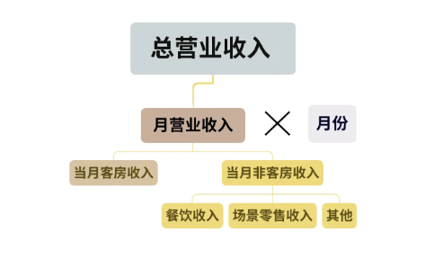營業(yè)收入(月)=房間營收(月)+ 其他營收(會議室租金、餐廳收入等)