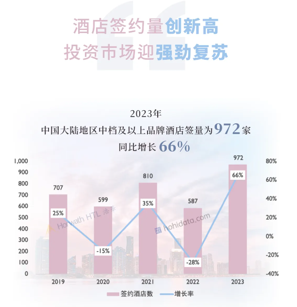 2023年全年,中國大陸地區(qū)中檔及以上品牌酒店,簽約量顯著回升,總簽約量達(dá)972家,同比增長66%,創(chuàng)下近五年來的歷史新高紀(jì)錄。
