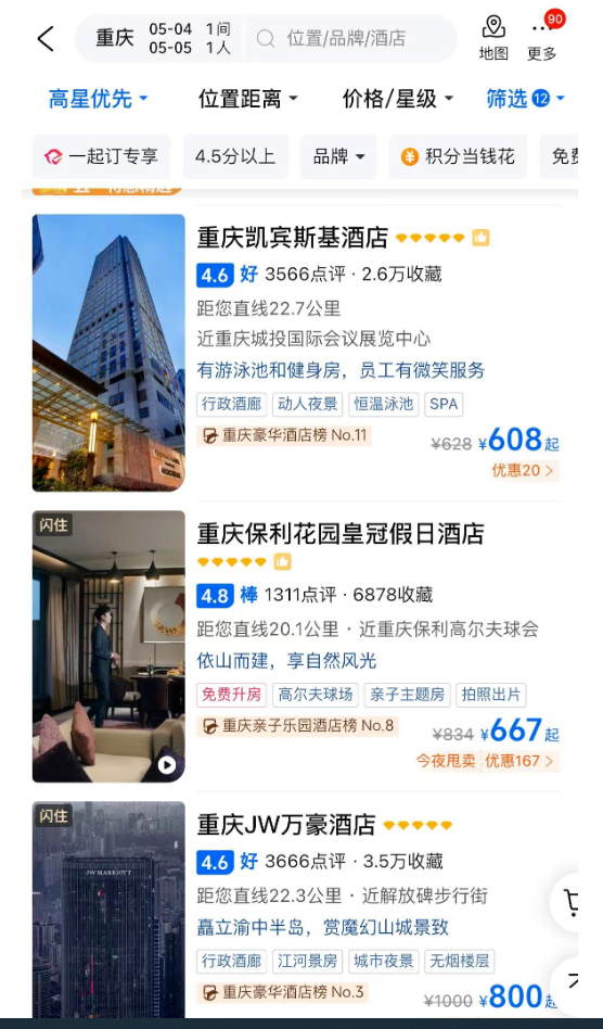 旅界查詢攜程平臺數(shù)據(jù)發(fā)現(xiàn),今年5月4日,重慶JW萬豪酒店僅800元/晚,重慶凱賓斯基酒店、希爾頓酒店價(jià)格則僅為600元上下,價(jià)格甚至不如平日周末,可謂相當(dāng)親民。