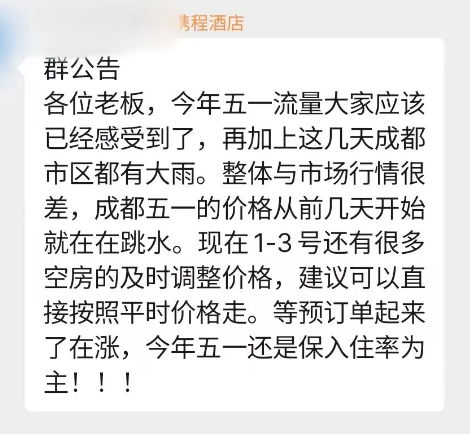 “各位老板,今年五一流量大家應(yīng)該已經(jīng)感受到了,成都五一酒店價(jià)格從前幾天就在跳水?,F(xiàn)在5月1-3日還有很多空房的請及時(shí)調(diào)整價(jià)格,建議可以直接按照平時(shí)價(jià)格走。等預(yù)訂單起來了在漲,今年五一還是保入住率為主?!?/span>